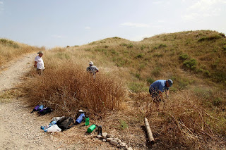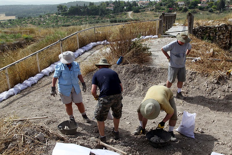 Day One of the Gezer Water System Expedition was a long, hot day. The temperature reached 99 degrees and we all felt the strain. Not much to report today. In fact these three photos tell much about the day. We made a lot of sand bags. We cut a lot of weeds. We also set up our camp including a large shade cloth for our meetings and meals. More set up tomorrow. Hopefully we will start digging tomorrow as well. Looking forward to an exciting season.